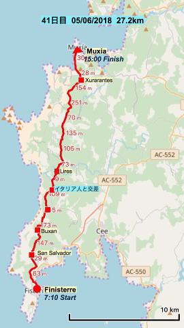Finisterre 7:10~San Salvador 8:00~Buxán 8:45~Lires 10:20~Xurarantes 14:15~Muxia 15:00 |