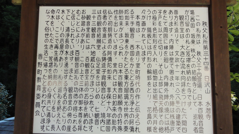 5日目は最後に残った札所34番を回るのみです。 龍勢会館に行くと火曜日で本日休館。今日は10q足らずの行程なので少し寄り道と思い、先ず、椋神社へ。境内では観客席を作る作業の真っ最中。少し離れた所では関係者以外立ち入り禁止でロケット作りをしていました。工事関係の人が、今日はロケット発射台まで行けるというので、近くまで行って写真に収めました。神社の人の話だと、今年はフジテレビで放送されたアニメ「あの花」の影響もあり雰囲気が違うとのこと。 11時に椋神社を出発して33番水潜寺(すいせんじ)に向かいます。1時間程舗装された坂道を登ると、例によって「熊注意」看板がある山道へ。ここから約1時間で札立峠(標高517m)を経て水潜寺に到着しました。なかなか厳しい山道でした。本堂の前には「(昨年と思われるが)9月25日、11月7日、11月11日に水潜寺、札立峠に熊が出没、注意を」との張り紙がありました。特にこれから冬眠前までは注意が必要ですね。 帰りは、バスで秩父鉄道皆野駅に出て御花畑へ。西武秩父の仲見世の蕎麦屋でゆっくりして帰宅しました。 |