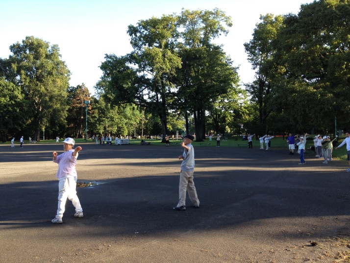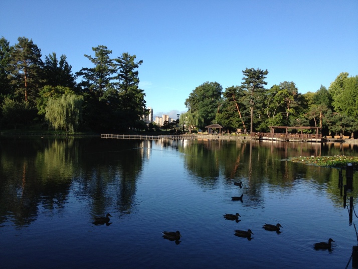 早朝、近くの常盤公園をウオーキング、地元の人たちとラジオ体操もやりました。