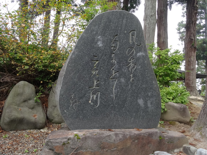 | 昨日の終点芦沢まで電車で戻って出発です。名木沢宿を過ぎると猿羽根(さばね)峠への道に入ります。暫く山道を進むと、日本三大地蔵の一つ猿羽根山地蔵尊に着きました。芭蕉句碑『月の香も南に近し最上川』があります。これはおくのほそ道には載っていませんが、芭蕉が新庄の風流・盛信に招かれた時に猿羽根峠の眼下を流れる最上川に着想を得て詠んだ発句で「曽良俳諧書留」に入っています。又、猿羽根峠と芭蕉の関係の説明板もあり、偶々お堂の補修工事をしていた作業員の人達と暫し奥の細道談義をしました。