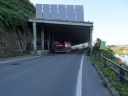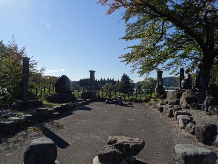 舟形駅で休憩、更に歩を進めて鳥越の一里塚を越え国道47号線(鶴岡街道)に合流した所に運よく食堂があったので昼食をとりました。右前方に鳥海山を眺めながら歩いていき、2時過ぎに芭蕉が最上川舟下りで乗船した本合海に到着しました。芭蕉広場があり、芭蕉と曽良の像や『五月雨をあつめて早し最上川』の句碑があります。ここで暫く休憩して、まだ時間があったので明日の最上川舟下りの乗船地古口まで歩くことにしました。 ところが、ここからの鶴岡街道は歩道無しでトラックの往来も多く厳しい歩きになりました。トラックのすれ違い時は脇に寄りたいのに最上川沿いなのでガードレールが直ぐそこ、ギリギリまで体を外に寄せ、固くして行き過ぎるのを待つしかありません。これを繰り返しながら7qほど歩き、漸く古口に到着です。 |