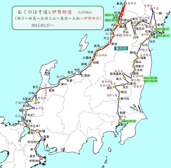 四回目は酒田から北上して象潟へ、その後は日本海に沿って南下、芭蕉が泊まらなかった柏崎までの行程。徒歩300q、電車77qの予定です。 初日は朝一番の便で庄内空港へ。開港25周年記念で「つや姫」2合をもらって酒田からスタートです。酒田は3年前の研修旅行で来ているので復習を兼ねた散策です。先ず「本間様には及びもせぬが、せめてなりたや殿様に」と詠われた日本一の大地主、本間家旧本邸を眺めて、芭蕉が宿泊した不玉亭や句会を開いた近江屋跡、安種亭の標柱を確認、日本永代蔵に出てくる旧鐙屋もありました。日和山公園に行くと日本最古の木造灯台や芭蕉像、句碑があります。丁度、朝の散歩をしていた地元の人から、芭蕉が上陸した場所を教えてもらいました。 公園近くの海向寺を参拝、ここには即身佛堂がありますが拝観は出来ませんでした。また、海向寺の前の坂道が「おくりびと」のロケ地だったようです。酒田酒造を見て羽州浜街道を北上します。宮海橋を過ぎて暫く行ったところを左折して、旧青山本邸を見学。ニシン漁で成功し北海の漁業王となった青山留吉の豪邸で国重文。その先は海岸沿いを歩きます。最初の5qは道路に砂が被さった道を歩いて行きますが、十里塚を過ぎた辺りからは完全に砂浜を歩きます。砂浜に車の轍が出来、そこを歩いていきます。約3qの砂浜歩き、左に日本海、右に鳥海山の絶景を見ながらの歩きはいい経験でした。 今日の宿は遊佐町の「遊楽里」、遊佐町応援団の登録をすると宿泊料が2割引きになるというので早速登録、更に遊佐町プレミアム旅行商品券2,500円分ももらいました。幸先良いスタートです。 |