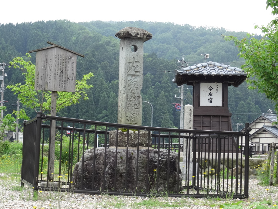 コンビニで昼のおにぎりを買ってスタート、先ず、燧ケ城址(270m)を登ります。「源平盛衰記」や「太平記」に度々登場、戦国時代にも一向一揆の拠点になるなど数世紀にわたり戦略上の重要な拠点として利用された城。結構急な道を登って頂上に着くと今庄宿が一望出来ます。下って今庄宿の南の外れには「文政の道しるべ」。北陸道(京・敦賀・若狭)と北國街道(京・伊勢・江戸)の追分の道しるべ。石柱には「右京 つるが・わかさ道」「左京 いせ・江戸道」と刻まれています。