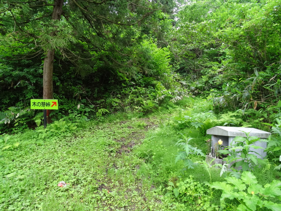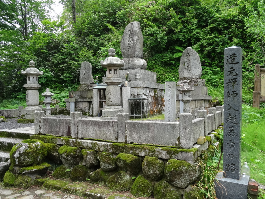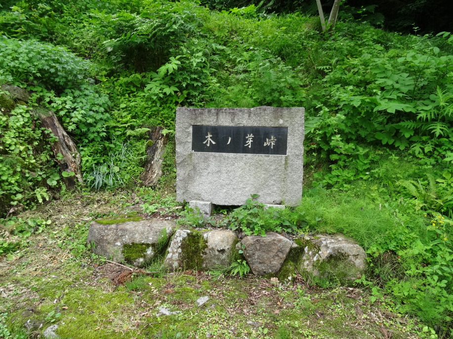 北國街道を進み、二ツ屋宿跡を過ぎて長いアプローチを進むとスキー場にぶつかります。ここを横切りながら登っていくと、言奈地蔵があります。その先が木ノ芽峠。石畳を登りきると茅葺の民家が現れます。1466年から代々、木ノ芽峠の茶屋番兼関所役を勤めている前川家です。大型犬が4匹(ノーリード3匹)いて少し怖い感じもしましたが、オヤジさんを呼んで家の中に入れてもらいました。500年前からの家で数年前に解体・補修工事をしたとのこと。家の前に平重盛の墓があるので聞くと、前川家は平重盛から50代続く家柄だとか。又、道元禅師の立派な碑があります。これは永平寺が建立したもので、永平寺で修行を終えた僧達は先ず最初にここに来てお参りをする習いになっていると。(道元禅師は木ノ芽峠を越えて永平寺に行ったことからでしょうか。)