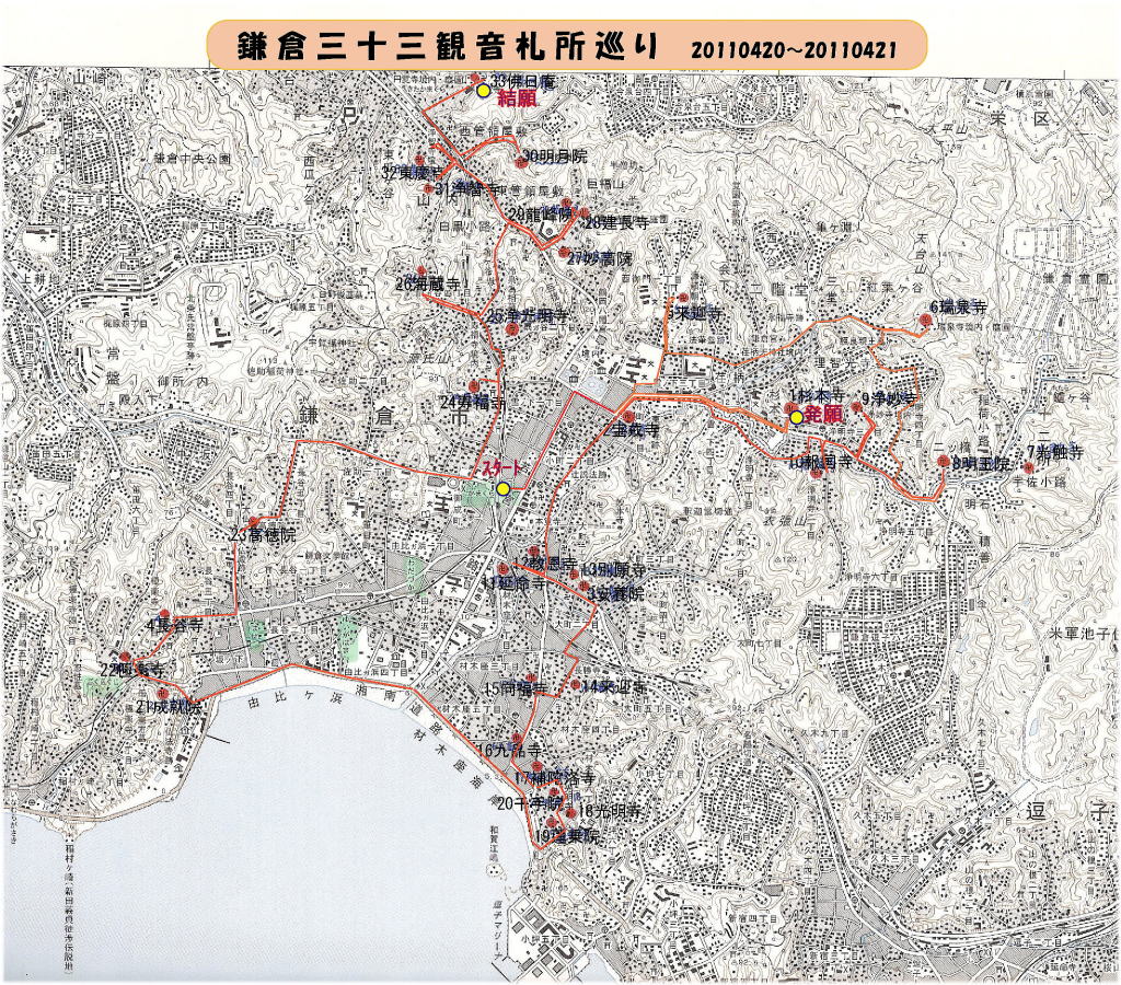 | 御朱印帳を持って鎌倉三十三観音札所巡りをしてきました。 先日、学生時代の旅仲間の後輩M渕氏から、「御朱印でめぐる鎌倉の古寺」「御朱印でめぐる京都の古寺」の2冊の書籍が送られてきました。これはM渕氏が企画・編集し、同じく後輩のO川女史が執筆したもの。 実は、今年は御朱印帳を持って熊野古道を歩くことを話した処、早速送ってくれました。御朱印の基礎知識が得られてとても参考になります。 ぱらぱらと本を見ているうちに体がむずむずとしてきました。 4月にスタート予定の熊野古道の旅は東日本大震災や原発事故のこともあり延期しています。 今月に入って、自粛・自粛から漸く日常生活へ戻る雰囲気も出てきています。そういう中、自分に出来ることは何かという事で、「被災者の方々の一日も早い立ち直りと福島第一原発の沈静化」を祈願して鎌倉三十三観音札所巡りを行うことにしました。 1番札所の杉本寺から33番札所の佛日庵まで31kmの行程、これを2日で歩くことにしました。 |
