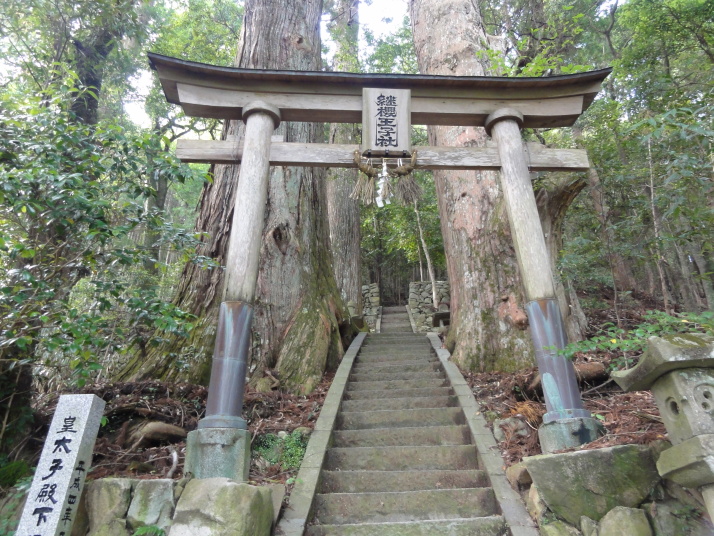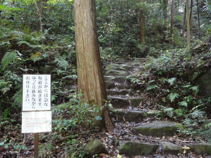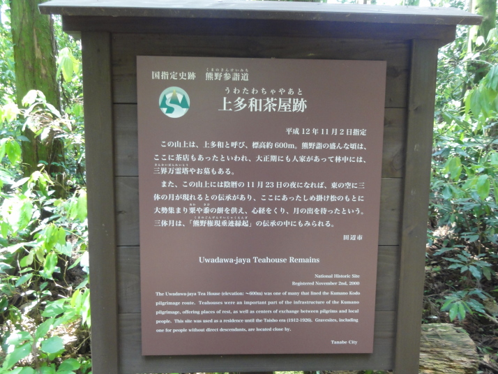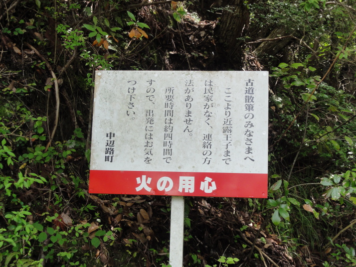 8時に田辺駅を出発、9時前に滝尻王子をスタートです。天気は晴れでちょっと安心。 ちょっと下って又、登ると飯盛山山頂(340.7m)の展望台に出ますが、大きな蜂がいて休憩が出来ません。針地蔵尊や夫婦地蔵を経て10時半に高原熊野神社に到着。高原霧の里休憩所や展望台があり、ここで暫く休憩です。旧旅籠通りの急な石畳を登ると山道に変わり、11時半に大門王子に着きました。ここから暫くは平坦な道が続きます。12時に十丈休憩所で昼食です、今日も田辺駅キオスクのお握り弁当。更に十丈王子を経て小判地蔵を過ぎ、最後の急な登りを行くと、今日の最高地点標高600mの上多和茶屋跡に到着しました。 13時30分に大坂本王子を通過し、14時に箸折峠(287m)の牛馬童子に着きました。「花山院が熊野詣の際この地で昼食をとった時、箸を忘れたことに気づいた随従の者が茅を折って花山院に渡した。花山院はその茅から血の様な赤い露がしたたり落ちるのを見て『これは血か、露か』と訊ねた。以来、熊野の山の人々はこの峠を箸折峠と呼び、はるか眼下に見える里を血か露(近露)と呼ぶようになった」とのこと。そして牛馬童子は花山院の旅姿とも言われています。14時20分に近露王子に到着。今日はここに泊まる予定にしていますが、早いのでもう少し先に進むことにしました。旅館の主にその旨を話すと、今日の終点で電話すれば迎えに行ってやると(ラッキー)。これで安心して進めます。 近露にある近野小学校の校庭は全面芝生。その前を通ってだらだらと坂を登っていくと、比曽原王子(455m)に到着、更に進んで15時35分に継桜王子(506m)に着きました。境内を護るように樹齢800年以上の杉の巨木群があります。野中の一方杉と呼ばれ、全ての枝が南の方角(那智山)を指しているというご神木です。その先に「とがの木茶屋」があり、更にその先には秀衡桜がありました。安部清明腰掛け石に座って中川王子を経て、16時半に小広王子(535m)に到着。本日はここまで、旅館の主に電話して迎えに来てもらいました。 今日の宿「月の家旅館」の客は、私と中辺路を歩いている夫婦連れの計3人。 |