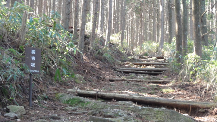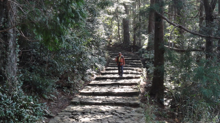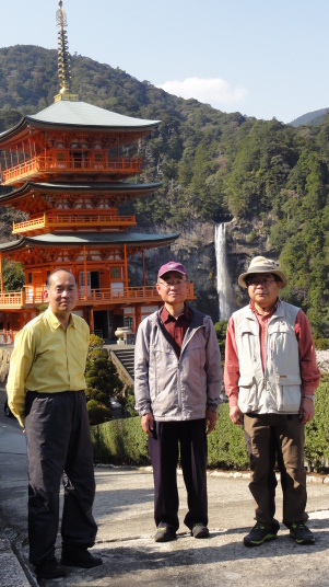 小口から大雲取越えで那智山まで歩き、青岸渡寺と熊野那智大社をお参りし、大門坂まで歩く16kmの旅です。 朝6時40分に出発、30分ほどすると円座石(わろうだいし)に着きます。熊野三山の神々がここで談笑したという御座所で、苔むした岩肌に熊野三山の本地仏が梵字で彫られています。(右:阿弥陀仏(本宮)、中:薬師仏(新宮)、左:観音仏(那智)). 8時過ぎに楠の久保旅籠跡を過ぎると大きな岩に南無観世音菩薩と彫ってありました。更に楠久保の地蔵が静かに佇んでいます。過酷な熊野詣の途中に志半ばで力尽きた人々の霊を供養した所で、他の場所にも地蔵菩薩がありました。最後の急坂の胴切坂を上って、9時45分に越前峠(840m)に到着。付近には卒業記念で大雲取越えをした小学校の記念板が立っています。 峠を越え急な下り坂を進んでいた10時半ごろ、那智方面から登ってくる人に遭遇。一人旅の老人でこれがビックリ。御年86才の千葉から来た方、滝尻から中辺路で本宮大社まで歩き、川下りで新宮に行き、更に歩いて那智大社を参拝して大雲取越え・小雲取越えで本宮大社に戻るという、平安時代の熊野詣の正規コース。トータル90kmを超すアップダウンの激しい道を連続して歩き通しているとんでもない老人です。「これが最後だから・・」と言って家を出てきたと笑っているが、顔の色艶、声が若々しい全く元気な人でした。 地蔵茶屋跡で昼食した後、また上りを暫く進んで13時過ぎに舟見峠(883m)に到着、遥か先には太平洋を望むことができました。 青岸渡寺三重塔と那智大滝の絶景を眺めてから、青岸渡寺(西国巡礼の一番札所)、熊野那智大社(主祭神は夫須美大神(イザナミノミコト))を参詣し、大門坂を下ったところで今日の旅は終了、バスで紀伊勝浦へ。 |