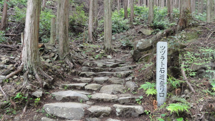 いよいよ熊野古道最終行程になりました。今回は紀伊長島から伊勢神宮まで80kmを歩き、最後は二見浦の夫婦岩で日の出を拝んで帰るつもりです。今日は前回と同じ電車で紀伊長島まで来て、12時半過ぎにスタート。357mのツヅラト峠を目指します。峠の麓まで地元の人と一緒に歩きましたが、その人はテニスのラケットを小さくしたようなものを持って歩いています。虫よけの道具だとか、これがあれば蜂ややぶ蚊は大丈夫ですね。だた、マムシが出るから注意!と脅されました。 九十九折から名前が付けられた通り、結構急な斜面もあり登り甲斐のある道でした。峠からの展望は素晴らしく、昔の旅人も伊勢から来て最初に見る熊野灘に感激したでしょう。天気が良ければ最高ですね。その後は大内山まで歩いて早目に投宿しました。 |