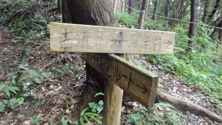 歩みは順調で、13時半には女鬼峠入口に。15分程で峠の下に来ると、「古道、展望台ルート」と「旧街道ルート」の標識。迷わず古道ルートを取ると、これが間違いの素。急にキツイ上りになり、展望台に着くと更に国束展望台の案内が、これに沿ってどんどん上るが一向に女鬼峠は越えてない雰囲気。急坂を降りて下に来ると見た事がある風景、ここはさっき通った女鬼峠入口。何と一周したらしく一時間半のロス、どっと疲れが出ました。