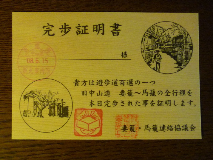 朝6時に散歩に出かけました。昨日は観光客で溢れていた街道も今朝は誰もいません。ゆっくり宿場を散策しました。妻籠寄りの高台に新しい展望台があります。平成の大合併で馬籠(山口村)が中津川市に合併されたことを記念して作られたようです。ここから恵那山の展望は素晴らしいものがありますが、馬籠(木曽路)が中津川(美濃路)に入ってしまうことには些か納得ができません。これも政治の問題ですかね。 8時半に宿を出発して、先ず藤村記念館を見学しました。記念館の横には木曽の五木(ヒノキ、コウヤマキ、アスビ、ネズコ、サワラ)が植えられています。隣は大黒屋。かつては酒造りをして年寄役を務めていましたが、現在はみやげ屋や飲食店となっています。大きな建物は、当時の裕福さを偲ばせてくれます。ここの当主が書き続けた「大黒屋日記」が「夜明け前」の構想を練る上で重要な役割を担ったことは良く知られています。 9時15分に妻籠を目指して歩き始めました。ここから馬籠峠までは登りが続きます。10時過ぎに標高801mの馬籠峠に到着しました。ここからまた山道となり、少しづつ下りながら進んでいきます。途中、樹齢300年のサワラの大樹や人懐っこい犬たちに会いながら、11時40分に妻籠宿本陣跡に着きました。妻籠宿は昭和43年頃から江戸時代の町並みを保存しようと運動を始め、昭和50年に国から保存地区に指定されています。ちょっと作り過ぎている感じもしないではないですが、当時の宿場の雰囲気を忠実に再現しているのは見事としか言いようがありません。 本陣を見学した後、観光案内所で馬籠〜妻籠を完歩した証明書をもらいました。これはヒノキで出来た証明書でいい香りがします。案内所で紹介された蕎麦屋で昼食を摂り、南木曽駅まで歩いて今回の旅を終了としました。14時過ぎの中央線に乗り、19時に帰宅、いつもよりは早い帰りとなりました。 |