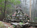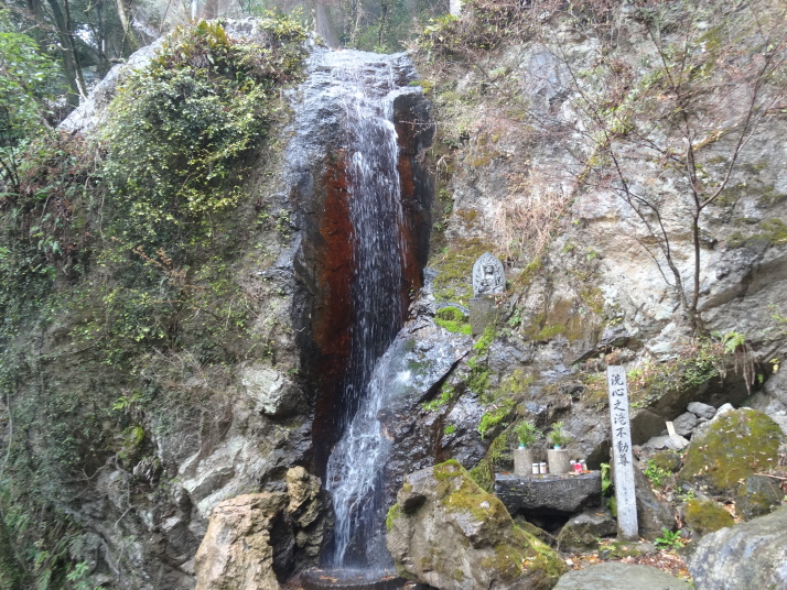 今日は一日中雨の中を歩きました。朝一番で19番立江寺を参拝した後、小高い山にある番外の取星寺に立ち寄り、更に進んで勝浦町に入っていくと、各家庭や店先に立派な雛人形が外から見られるように飾ってあります。メイン会場の「ビックなひな祭り」展に行きました。雨で濡れた格好で行くと、事務所に案内され合羽やなにやらをストーブで乾かしてくれ、お茶のお接待も受けました。一息入れてひな祭り展を見学、3万体を越える人形が所狭しと飾ってあり壮観でした。 道の駅でお接待の握り飯を食べて、番外星の岩屋へ。250mまで登ると、大きな岩から滝が落ち、ちょっと小太りな大師像があります。弘法大師が天空に現れた悪星を失墜させ、岩屋に封じ込めると石と化したので、この石を祀ったとの伝説があります。この滝は裏からも見られる裏見の滝になっていました。 |