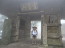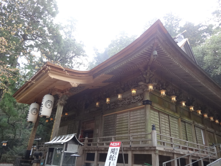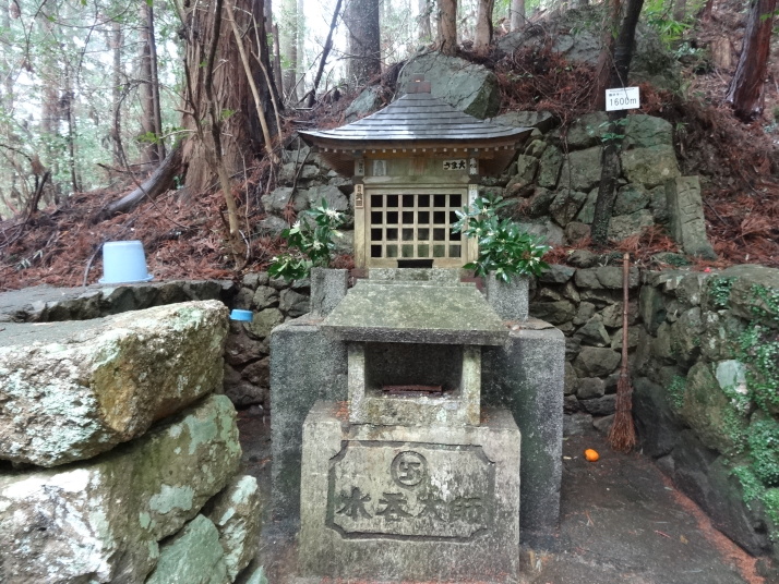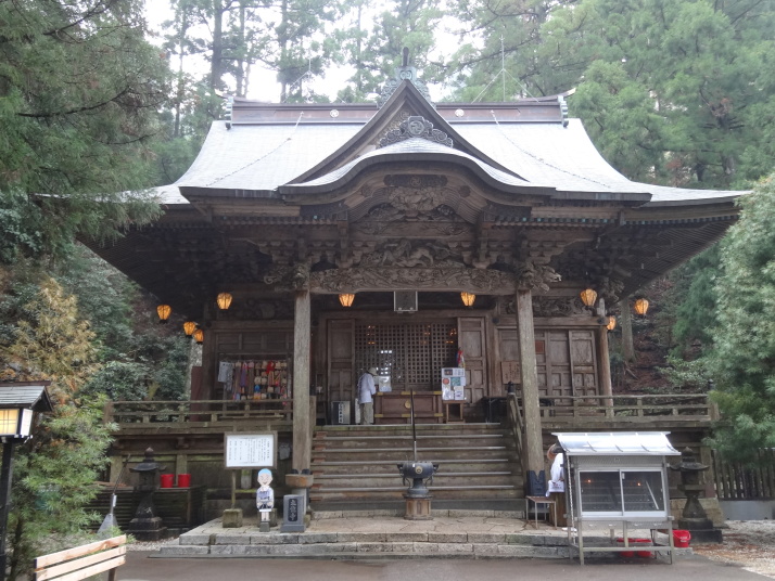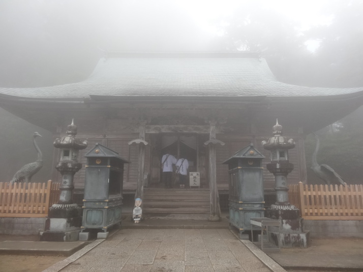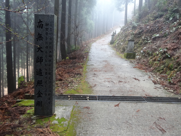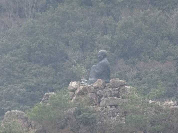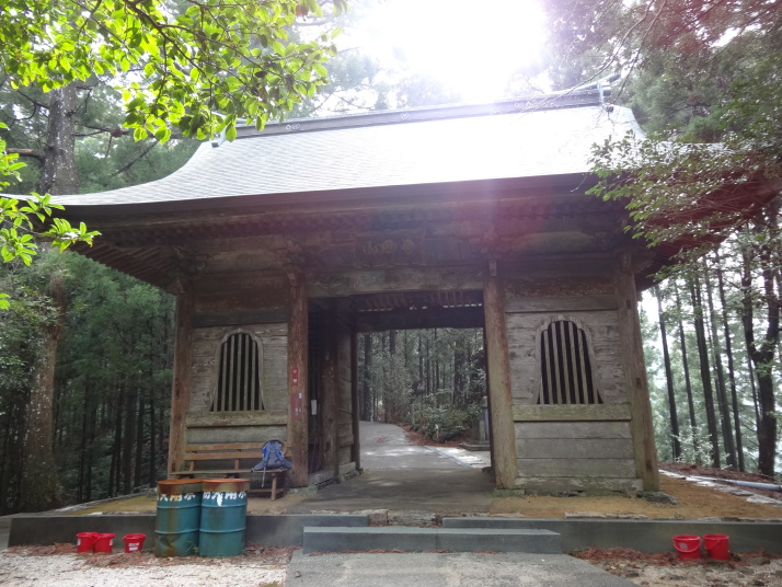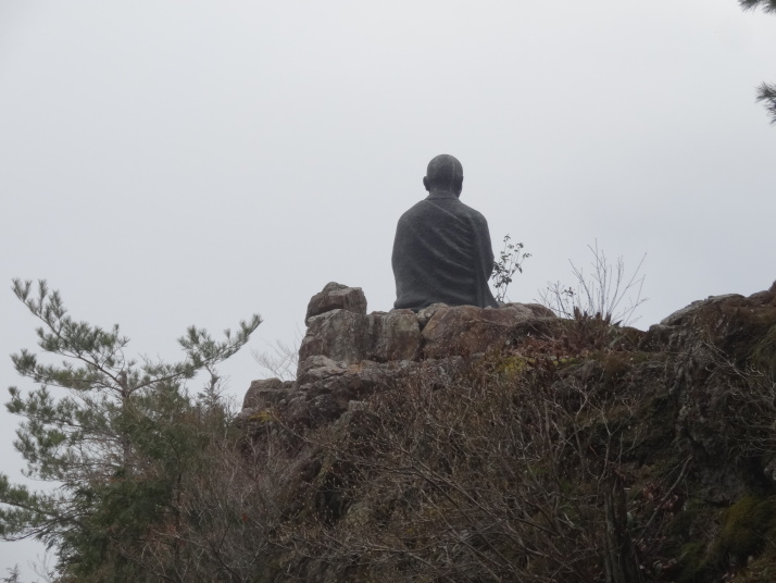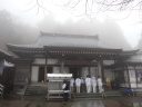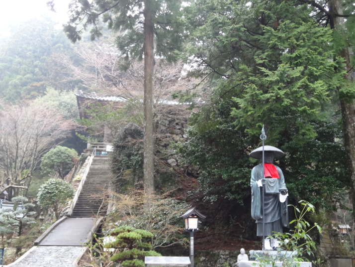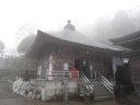 今日も朝から小雨模様。先ずは別格3番の慈眼寺へ、標高550mのお寺は霧に霞んでいました。途中へんろ小屋で休憩、雨が降っている時は屋根があるところでの休憩は有難いです。 雨で滑り易い坂道を下って1時間程で旧大井小学校跡へ。ここでお茶・菓子のお接待がありました。徳島大学の学生主催で歩き遍路をしているグループのお接待をする会とのこと。標高40mまで下って今度は登り、最初は緩やかな上りが続きましたが、その分、最後は階段状の坂道で標高を稼ぐ道になっていてこれが意外ときつい。15時15分にやっと太龍寺520mに着きました。参拝後、弘法大師が19歳の時、虚空蔵求聞持法を修法されたという番外の舎心嶽530mへ、修行する大師がいました。ここから麓へ下ろうと思っていましたが、危険注意の看板があり、安全第一でロープウエイを使って降り、今日の宿へ。 |