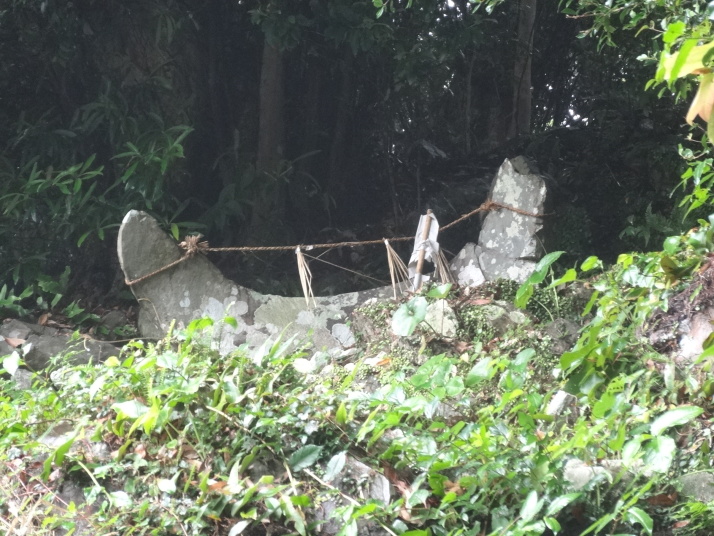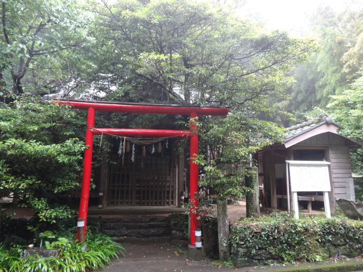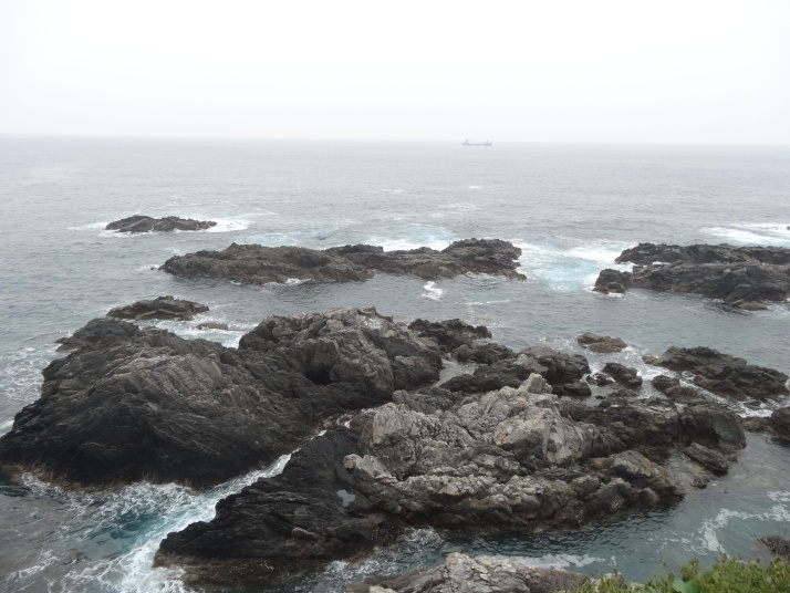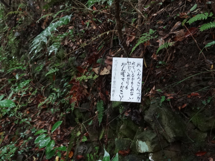 13時半ごろ叶埼灯台に着き、灯台の先の遊歩道を進み岬の先端へ。断崖絶壁の場所から雄大な太平洋を眺めました。この頃からポツポツと降り始め次第に雨は本降りに。そんな中15時ちょっと前に月山神社へ行く遍路道に入りました。この遍路道には地元の月山小学校の児童が作った激励の札が沢山掛けられています。これには本当に勇気付けられました。15時半に番外月山神社を参拝しました。 |