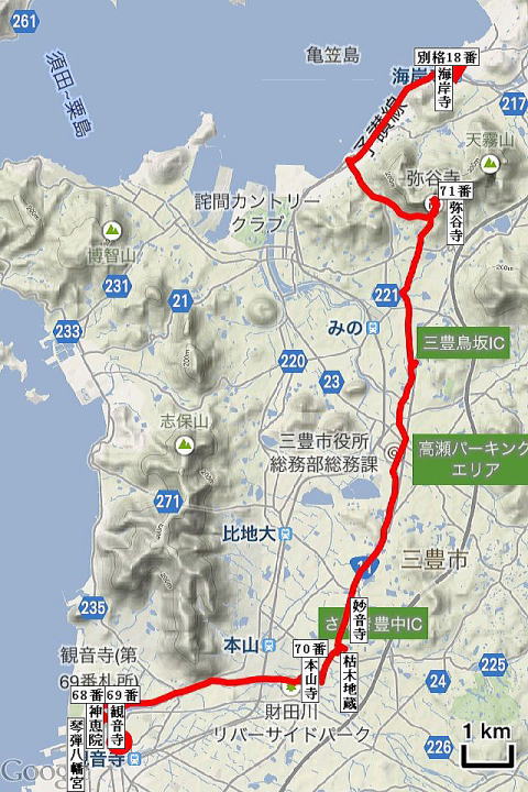 | ホテル7:30→琴弾八幡宮8:00→銭形展望台8:30→68番神恵院・69番観音寺9:00→70番本山寺10:10→枯木地蔵10:50→妙音寺11:10→71番弥谷寺14:00→別格18番海岸寺15:30→海岸寺駅16:00→高松から帰宅 |