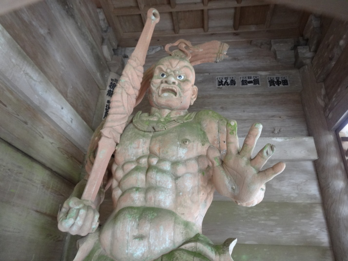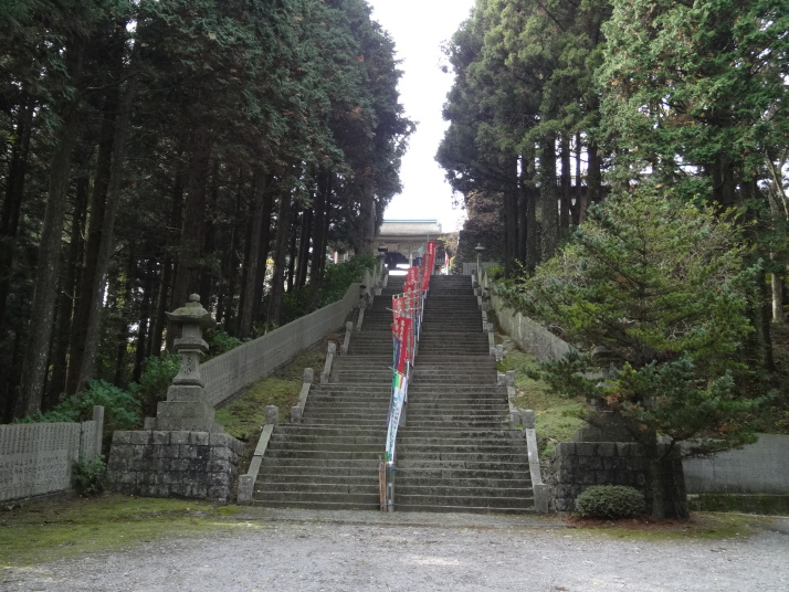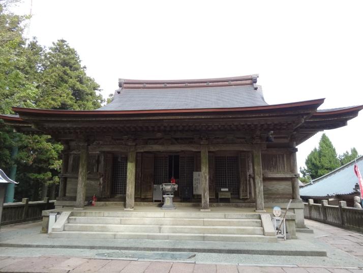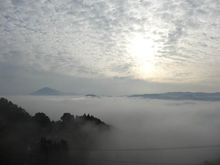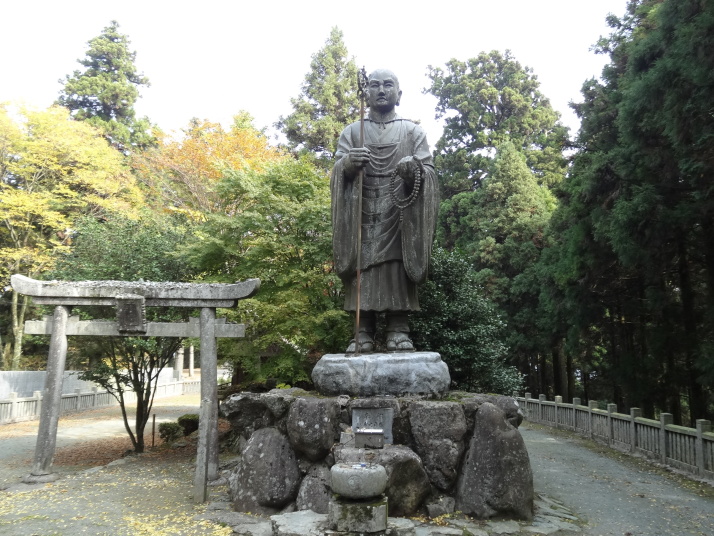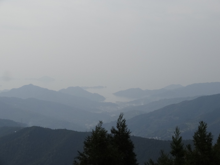 本日の目的は標高812mの出石山頂上にある別格7番出石寺、宿の主人から判りやすい地図をもらって早目に出発。先ずは舗装道路を上っていきますが、一時間程すると大洲の町が雲に覆われ幻想的な風景が現れました。約10㎞登った後は3㎞の遍路道を進んで10時半に別格7番出石寺に到着、大きな大師像が迎えてくれます。山門には銅鐘がかかっており、これを撞きました。本堂脇から伊予灘越しに九州・大分が見えるとのことですが、霞んでいました。境内にあるうどん屋で腹ごしらえをして下山、14時過ぎに大洲の町に戻り、大洲城を見学。