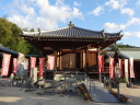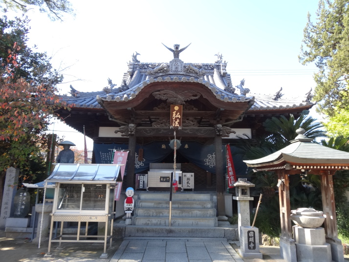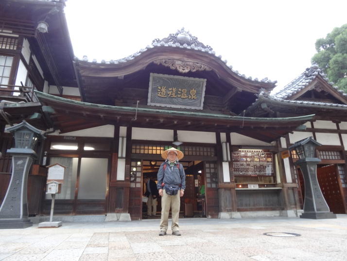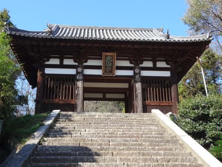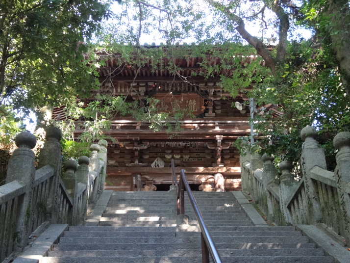 道後温泉を出発、本館前で外人さんにシャッターを押してもらって記念撮影、先月の松山観光で入湯しているので今回はスキップです。狭い通学路をすり抜けながら山頭火「一草庵」へ。47歳の時に八十八ヶ所を巡拝した後、11年後の昭和14年、死に場所を求めて再び四国遍路に出た山頭火は松山に安住の地を見つけ、一草庵と名付けた。翌15年10月11日未明にこの庵で脳溢血により死亡。生まれは山口県防府市で、3年前に山陽道を歩いた時に生家跡を訪れました。その先、松山大学のグランド脇の小高い丘にロシア兵墓地がありました。日露戦争の捕虜で亡くなった兵士の墓で、当時松山市民は捕虜を手厚く迎い入れ交流も盛んに行われたといいます。 9時に番外蓮華寺に到着、住職からみかんをお接待されました。数年前まで教師をしていたそうで、今日もこれから中学生が見学に来るとのことで、準備に追われていました。長閑な遍路道を進んで10時過ぎに52番太山寺の「一の門」へ。更に路線バスも入る道を進むと「二の門」である仁王門(重文)があります。ここから上り坂が続き、石段を上ると「三の門」の山門へ。本堂は嘉元3(1305)年に再建された国宝で、重厚なお堂です。 |