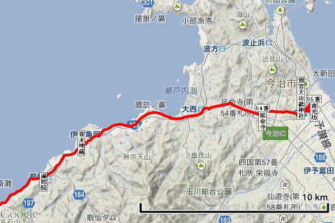 | 宿7:15→遍照院9:00→青木地蔵堂10:00→54番延命寺13:05→別宮大山祇神社14:20→55番南光坊14:40→JR今治駅15:00→帰宅 |