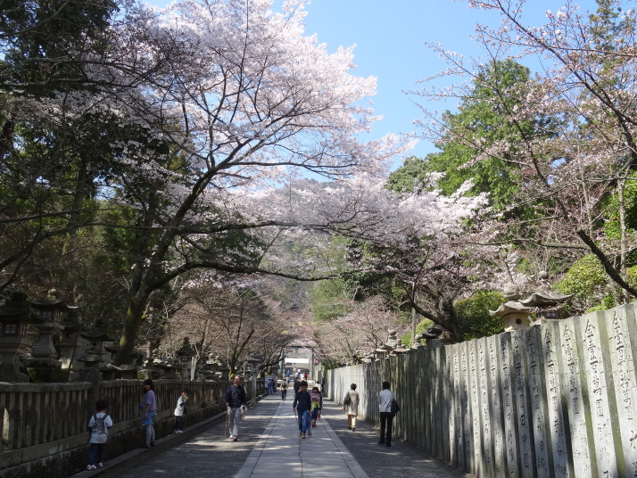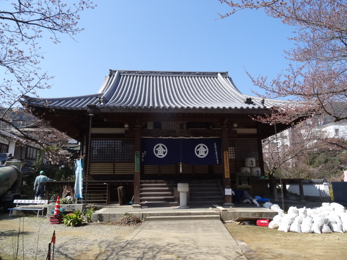 朝6時から御影堂で勤行があり、その後は地下にある真っ暗な通路の「戒壇巡り」へ。左手で壁を伝いながら真っ暗な道を進んでいると一種異様な雰囲気に包まれます。60~70m進むとうっすら灯りのある所に着き、「こんにちは・・・」とお大師様の声がします、これは日本音響研究所が再現したお大師様の声だそうです。低い優しい声でした。善通寺は弘法大師誕生の寺で父の名、佐伯善通から命名。東寺、高野山とともに空海三大霊場の一つに数えられる、重厚な本堂(金堂)、美しい五重塔がある立派なお寺でした。 隣接する番外観智院を参った後は7kmほど進んで琴平町へ。こんぴらさんと縁の深い番外松尾寺を経て近くの金毘羅大芝居(金丸座)に行きました。4月5日から染五郎の公演があるため今日から定休日、でも係の人に断って中を写させてもらいました。いよいよ「こんぴらさん」、参道は桜が咲き始めていました。途中の茶店に荷物を預けて石段を上ります。500段目にあったレストランで小休止した後、785段の金刀比羅宮本宮へ。更に583段上って奥社の嚴魂神社へ計1,368段、良く上りました。下に降りて昼食の後は満濃池へ。日本最古の農業用溜池で弘法大師が修復の大工事を指揮したといわれます。近くに別格17番神野寺があります。後はひたすら歩を進めて76番金倉寺を目指しましたが、納経時間の17時が過ぎるのが判ったので明日にして宿へ、18時にやっとビジネスホテルに投宿しました。今日は33.5㎞歩きましたが、直線距離では3.6㎞とあまり効率的でない一日でした。 夜は外食、国道沿いのホテルで近くに飲み屋がないので事前に調査済の店を探しましたが見つかりません。仕方なく偶々あった別の店に。でもこの店「ひな鶴」も結構良い店でした。かなりいい気持ちになって帰りがけにもう一度注意しながら進んでいくと、やっと本来の店「いち」が見つかりました。道路から奥まった所にあり、案内も出していない地元優先の店。ちょっと顔を出し隣の席のオッサンと小一時間馬鹿っ話をして退散しました。 |
